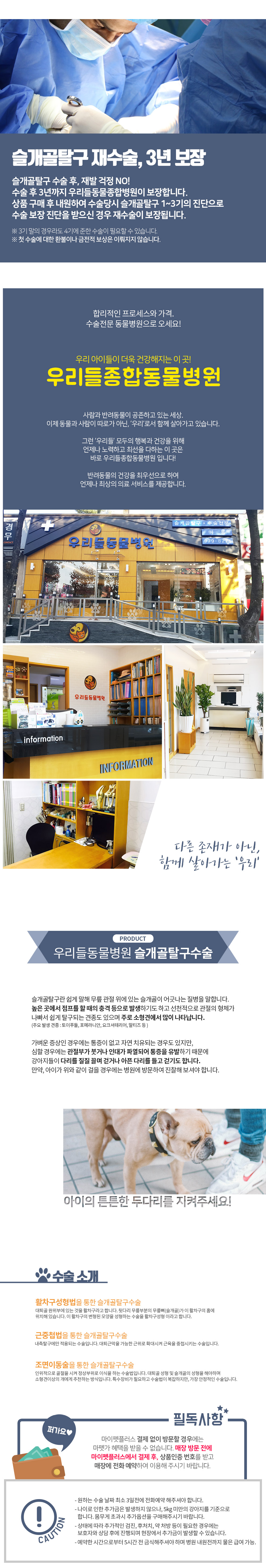 이처럼 강아지의 슬개골 탈구 수술 후 관리해야 할 부위뿐만 아니라 수술 후 염증과 통증을 줄이면서 입원을 통해 수술 부위를 안전하게 관리하는 것이 중요합니다. 청담에 갈 수 있으니 5일 정도 입원을 하게 됩니다. 수술 후 마취가 풀리면 아이는 통증과 염증을 느끼기 때문에 수술 후 즉시 해당 부위를 치료하여 이를 줄이는 것이 중요합니다. 또한 매우 중요합니다. 슬개골 탈구에 대해 궁금하신 사항이 있으시면 언제든지 동물병원으로 연락주시기 바랍니다.