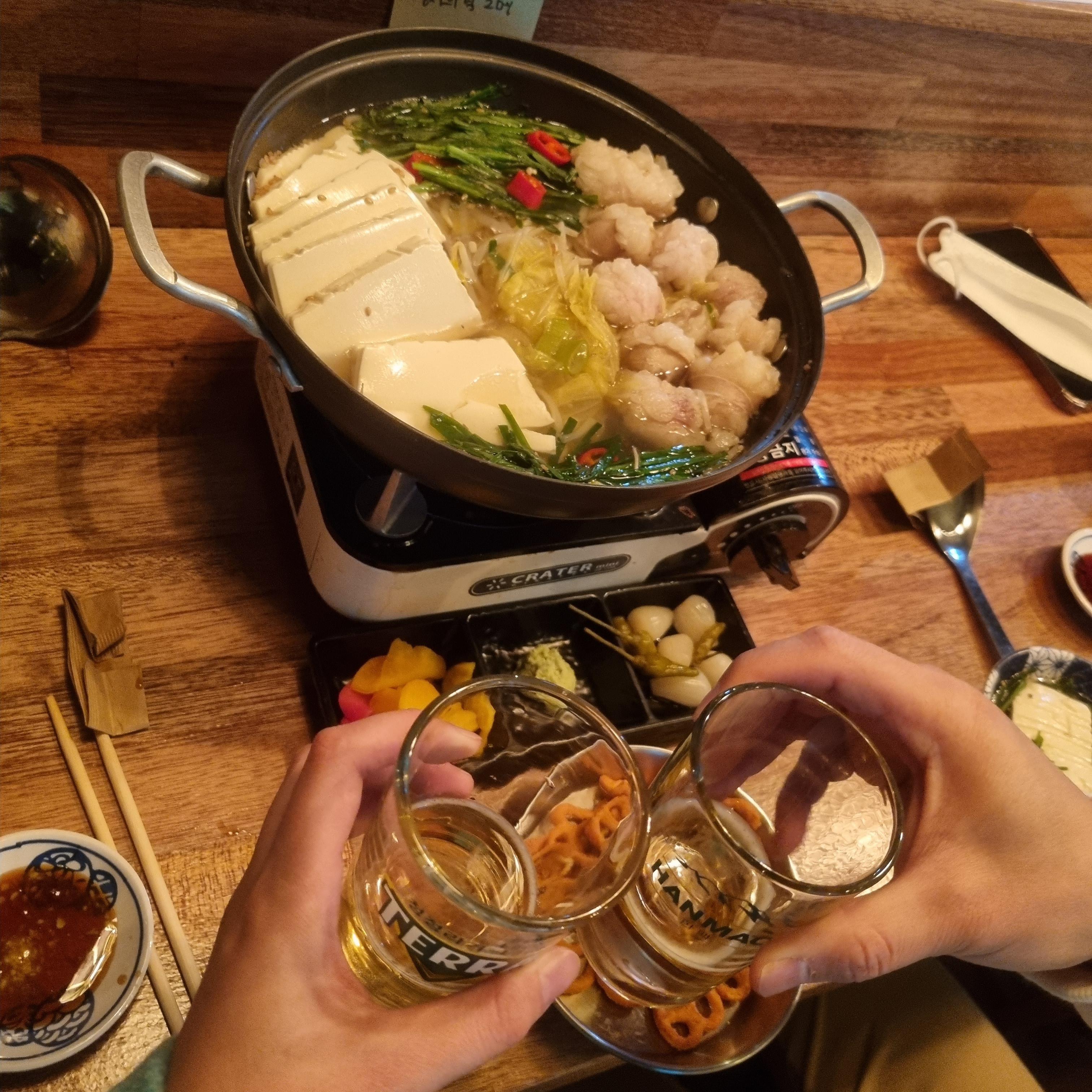 청주 사항동 선술집에서 맑은 육수에 대장과 각종 야채, 두부가 들어간 곱창전골은 처음 먹어봤다. 맑은 국물이라 좋았어요. 국물도 리필해주셨어요.